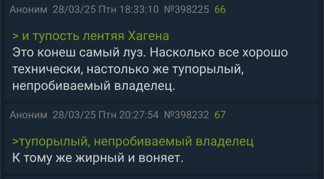 Обосрался не автор темы, а Хаген, который ради сохранения онлайна боится банить нарушителей. И то, что чучело, руинящее БГ, заходит на форум и даже в этой теме открыто показывает свою безнаказанность, - это лучший тому показатель.