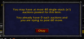 "Наш аукцион - это чудо программной инжинегрии, которое позволяет всем беспрепятственно непрерывно сканировать весь аукцион (но не забывайте, что мы боремся с перекупами, которым эта "фича" очень на руку, лол). Наш аукцион - прорыв в области оптимизации и быстродействия, но если вы попытаетесь купить больше 25 штучек Сквернопли, вы можете уронить наш сервер, лол. А еще база данных нашего замечательного аукциона спроектирована таким чудесным образом, что позволяет без нагрузки на сервер выставлять на аукцион поштучно несколько сотен (а может даже и тысяч) лотов (каждый из которых - уникальная ячейка), которые совсем ничуть не захламляют базу". Хотя даже аддоны не позволяют такого сделать, выдавая подобное сообщение: