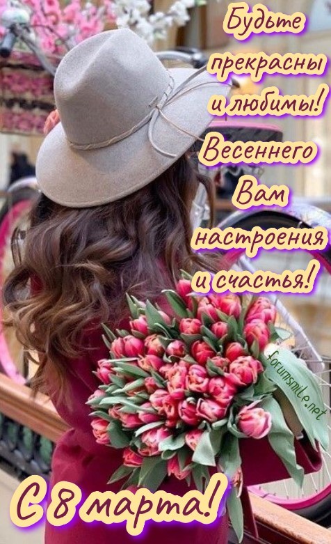 Поздравляю с 8 Марта! Желаю счастья, здоровья, успехов, душевного спокойствия, жизненной стабильности и, самое главное, любить и быть любимой. Не переставай быть всегда нежной, ласковой, доброй и неотразимой. Пусть эта весна подарит много тепла и счастливых мгновений. С праздником!