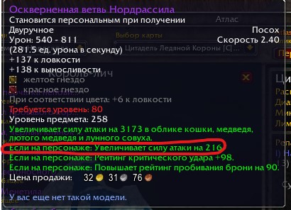 https://wotlk.ezhead.org/?spell=16975 не работает 20%-ный бонус к силе атаки от надетого оружия (должно учитывать любую "чистую" силу атаки на оружии: