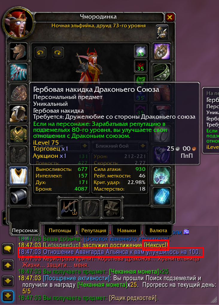 Ношу Гербовую накидку Драконьего союза, хожу в пп, репутация не прокачивается, вместо этого капает репутация с Авангардом Альянса.